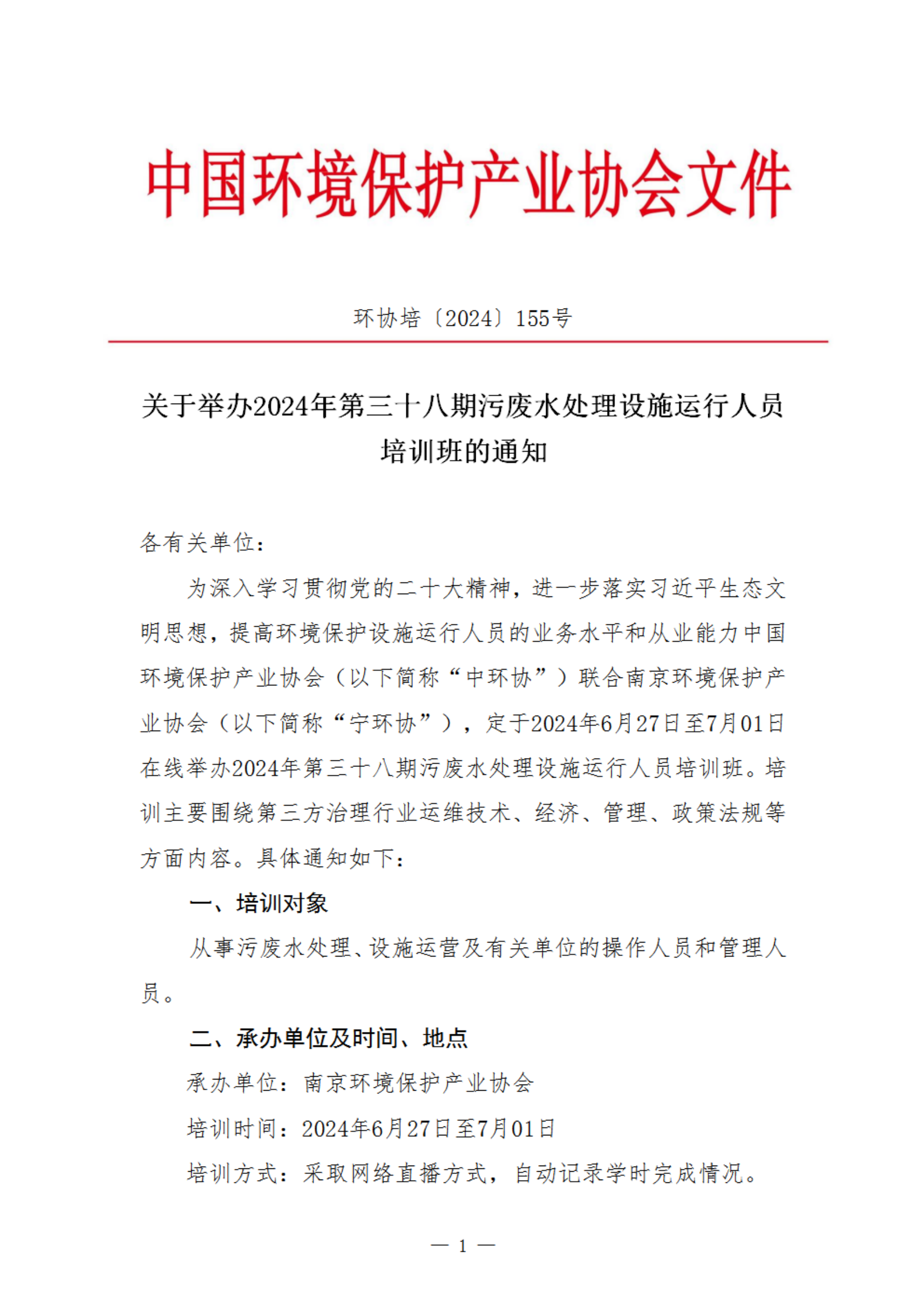 【培训通知】关于举办2024年第三十八期污废水处理设施运行人员培训班的通知