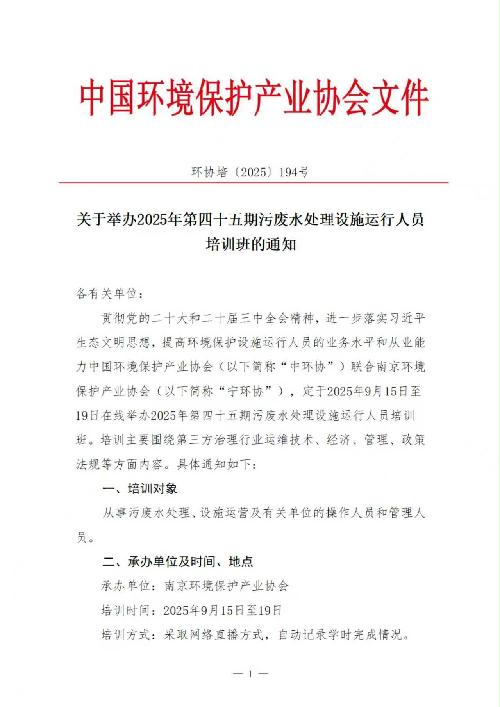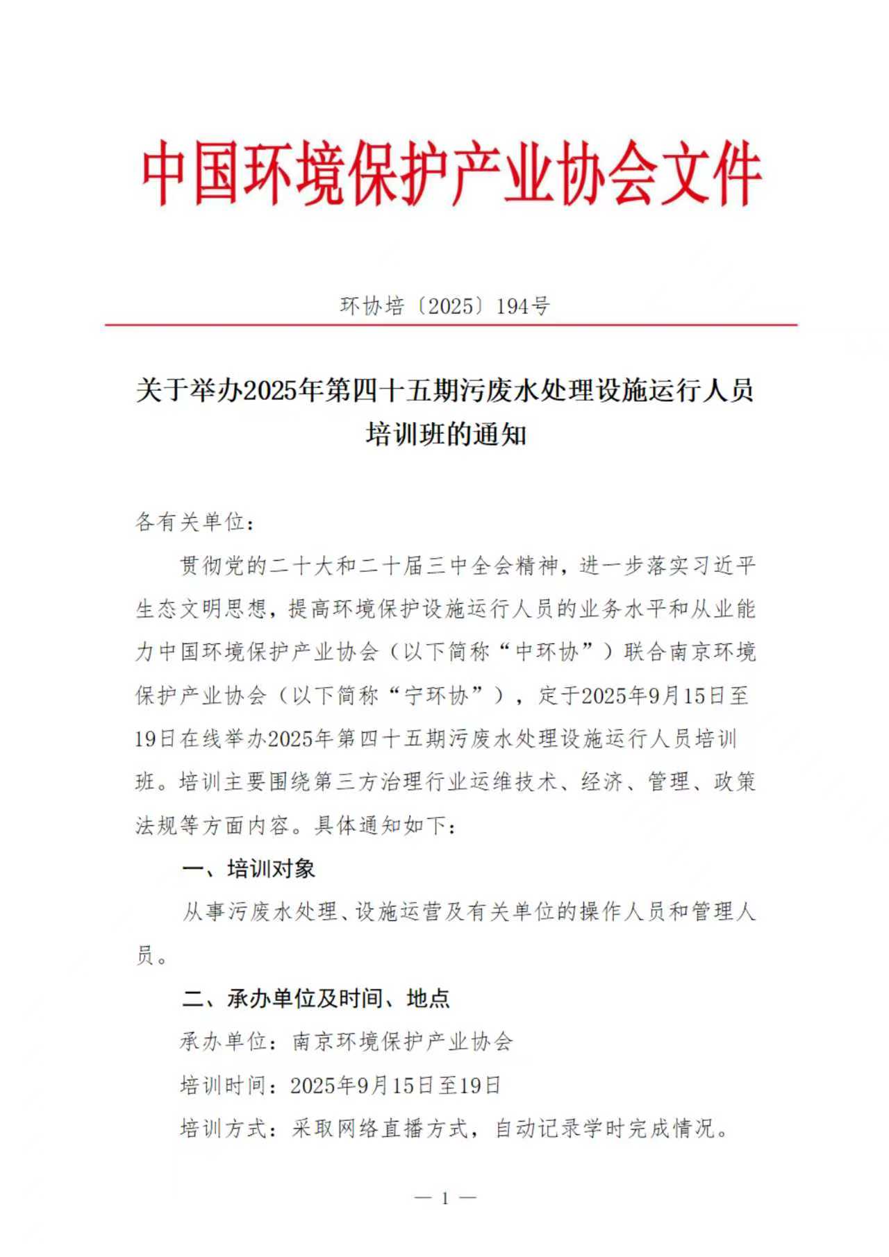 【培训通知】关于举办2025年第四十五期污废水处理设施运行人员培训班的通知